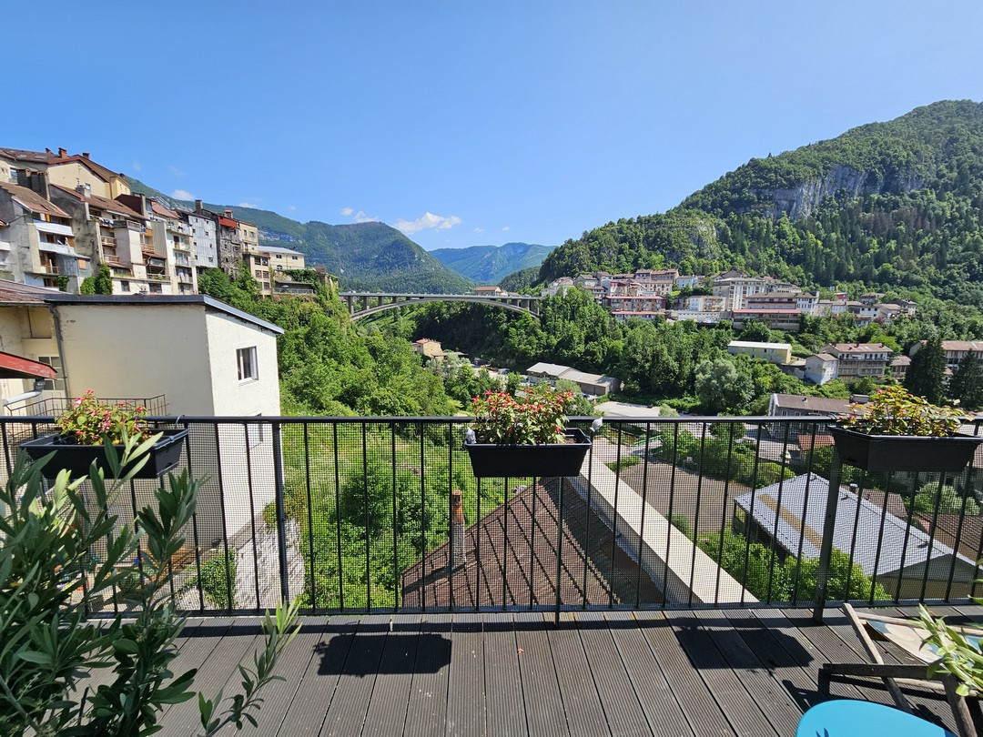 Saint-Claude, au calme : maison sur sous-sol Rez-de-chaussée : garage, chaufferie (chaudière fioul + chaudière bois), cave, rangement, une chambre d'appoint. 1er étage : hall d'entrée avec accès sur terrasse à l'arrière, cuisine et séjour avec accès sur balcon (possibilité d'ouvrir la cloison entre le séjour et la cuisine), 2 chambres, salle de bains, wc. Combles : grenier Terrain de 1 148 m² (en pente) avec abris de jardin. Contact : Alexandre Saillard : 06.8383.41.75