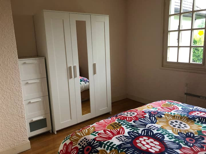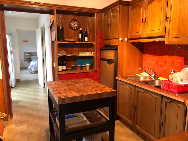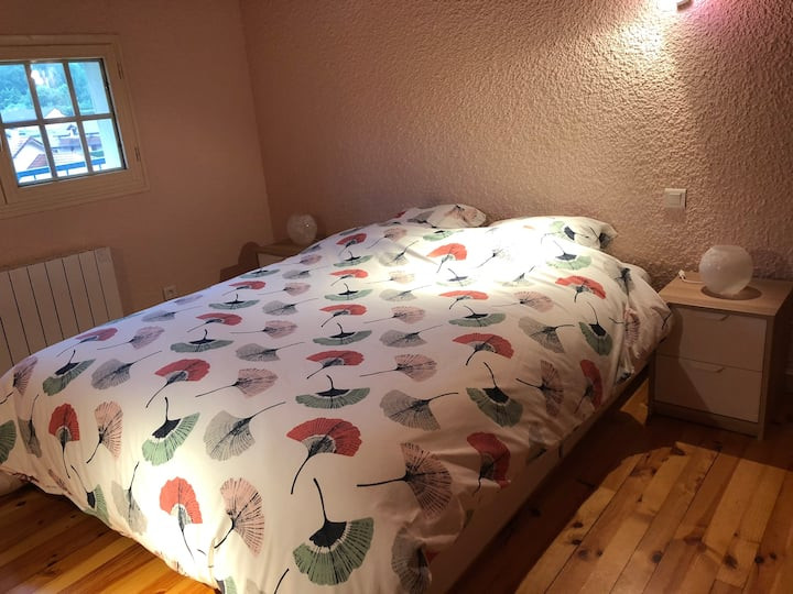 Rez-de-jardin : salon / salle à manger avec cheminée, cuisine équipée, une grande chambre avec salle de bains privative, une seconde chambre, salle de bain.