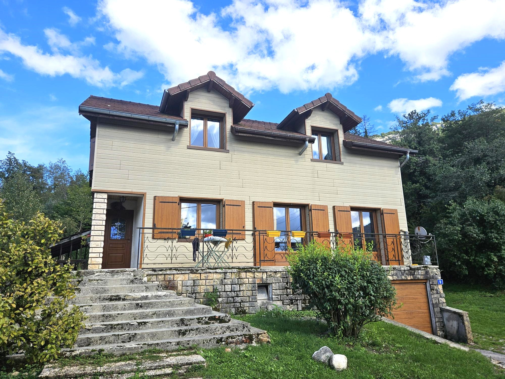 Rez-de-jardin : cuisine ouverte sur séjour avec poêle à bois et accès sur balcon, chambre, salle de bains, wc.
