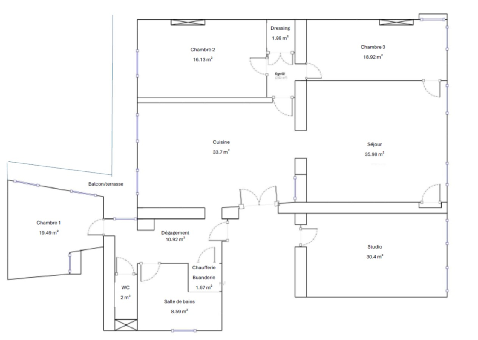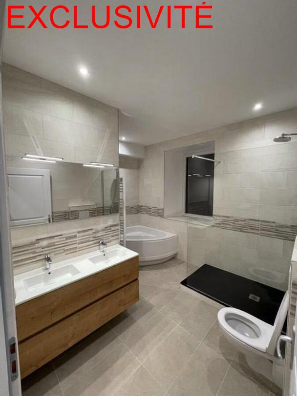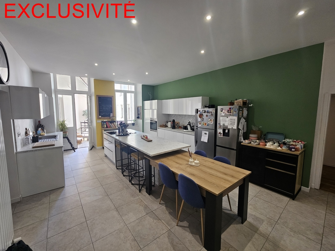 Cuisine intégrée / salle à manger de 33m² donnant sur séjour de 36m², salle de bains avec baignoire/douche italienne/double vasque, 3 grandes chambres, wc, chaufferie/buanderie, balcon en arrière-cour.