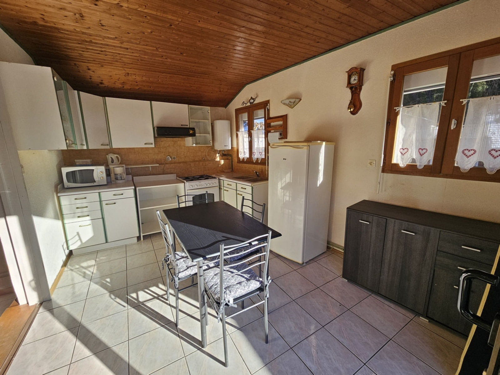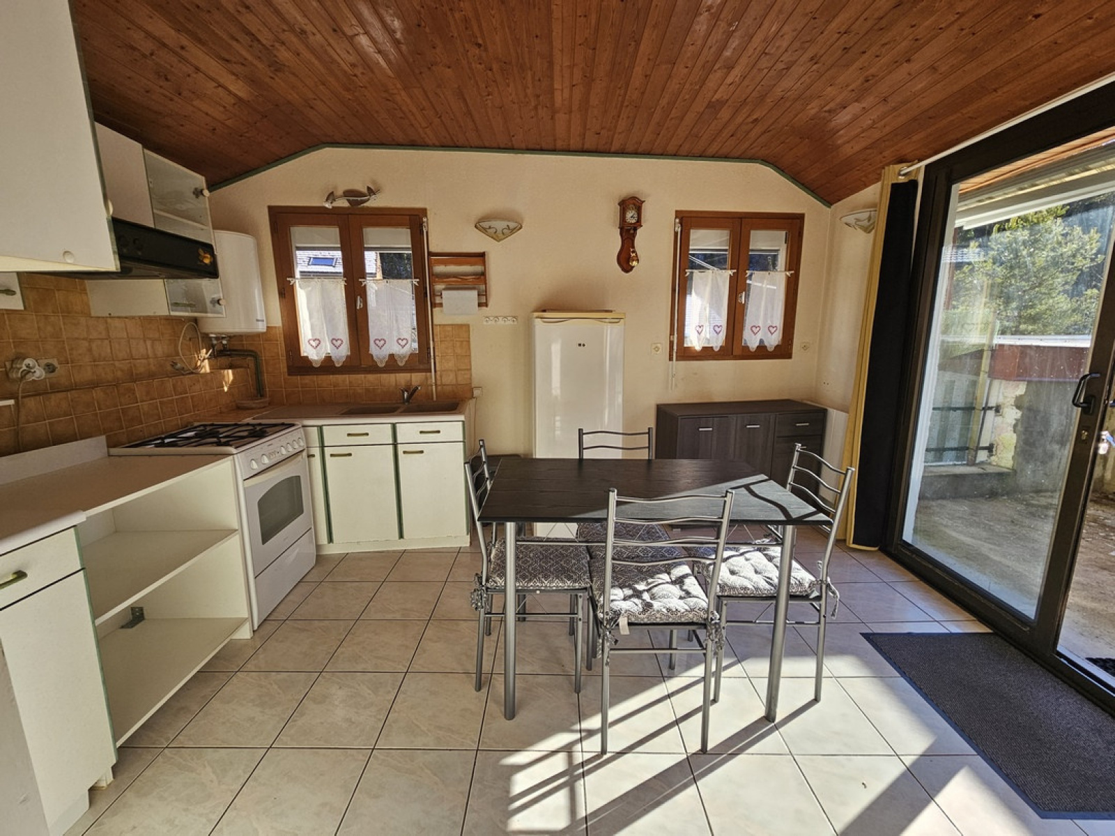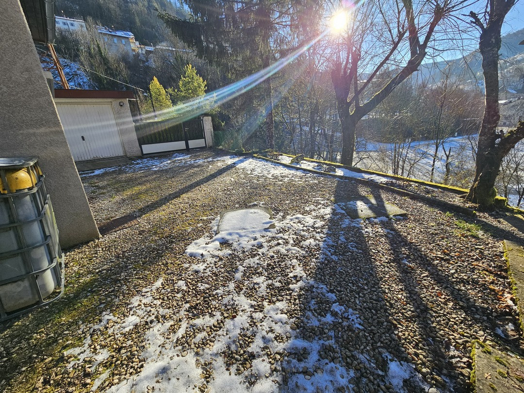 Saint-Claude, entre ville et nature, petite maison au calme en bordure de rivière composée d'une cuisine / salle à manger avec accès direct sur terrasse, un salon avec poêle à granules, une chambre, salle d'eau/wc, mezzanine. garage, abris de jardin/atelier, petite cour devant la maison, et terrain. Contact : Alexandre Saillard : 06.83.83.41.75