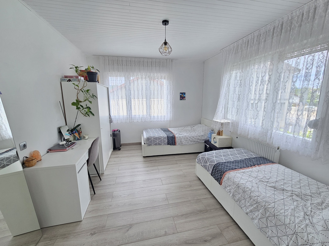 Saint-Lupicin, appartement de type F3 de 75 m² avec terrasse couverte et jardin clos et arboré. rdc : 2 garages, atelier, cave 1er : hall d'entrée, cuisine intégrée, séjour, 2 chambres, salle de bains, terrasse couverte. Le bien a bénéficié de nombreux travaux récents : isolation extérieure, pompe à chaleur, isolation de la toiture... Contact : Alexandre Saillard : 06.83.83.41.75