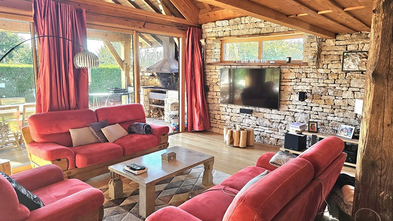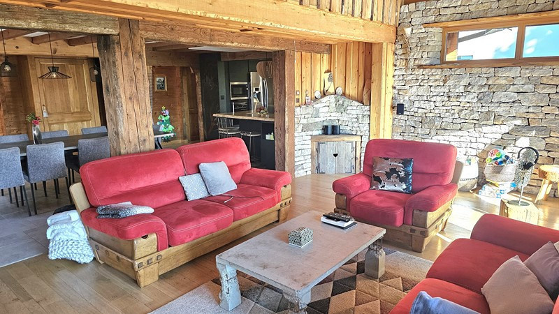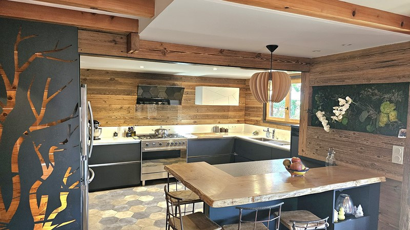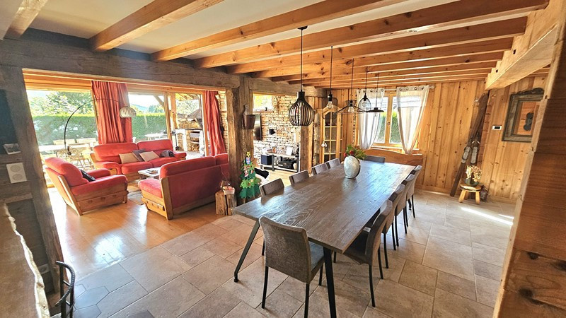 Secteur Champagnole, dans un village recherché avec école, exclusivité AS Habitat pour ce joli Chalet madrier de 1993 en excellent état, de 155 m² habitables, bénéficiant d'une prestation de grande qualité, il offre un espace de vie spacieux et cocooning de par ses aménagements haut de gamme et de grande qualité. Construit sur sous-sol complet donnant accès notamment à un grand garage (3 voitures). Il comprend au RdC : Entrée - Bureau - Cuisine haut de gamme 'Schmidt'' avec plan de travail granit et quartz, électro ménager haiut de gamme, ouverte sur Salle à manger spacieuse (30 m²) ainsi qu'un Salon lumineux très cocooning (29 m²), l'ensemble sur plancher chauffant et donnant sur magnifique terrasse avec barbedue (expo Sud) - Salle de bains - WC suspendu - Lingerie. A l'étage : 3 Chambres spacieuse (20, 21 et 12 m²) dont l'une bénéficie d'un dressing ''Schmidt'' - Cabinet de toilette avec WC. Au sous-sol : Complet avec Garage - Atelier - Chaufferie - Cave. Assainissement raccordé au tout à l'égout. Chauffage par Aérothermie (Pompe à chaleur et chaudière ''Mitsubishi'' neuves). Adoucisseur d'eau. Terrain de 836 m². DPE ''C''. Prix : 414 000 euros. Contact : Alain THIEBAUD Agence AS Habitat Tél : 06 84 11 46 85 / 03 84 42 48 35